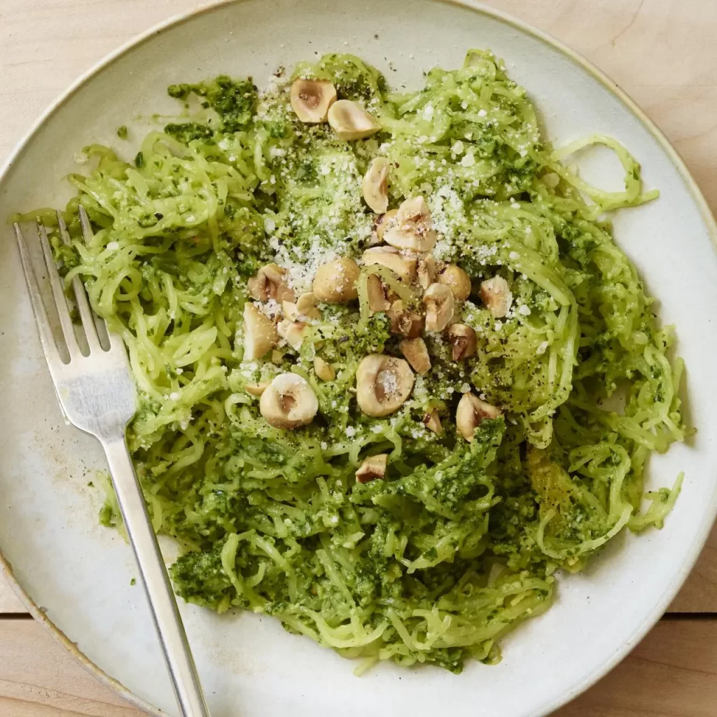 - Baked spaghetti squash with homemade walnut pesto and sautéed mushrooms