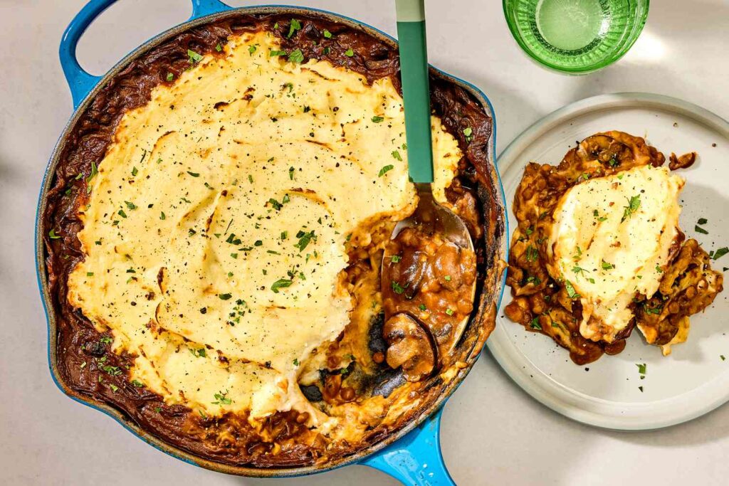 - Lentil shepherd’s pie with mashed cauliflower topping
