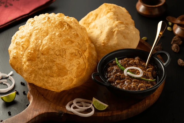 Known as “puffed deep-fried bread,” bhature is made from refined flour (maida), yogurt, and baking soda or yeast. The dough is fermented, rolled out, and fried until it puffs up like a balloon.