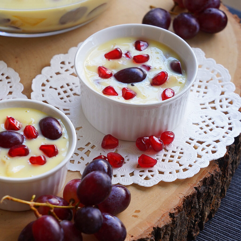 - Apple, banana, grapes, pomegranate, kiwi, mango, pineapple (avoid citrus in milk-based custard)