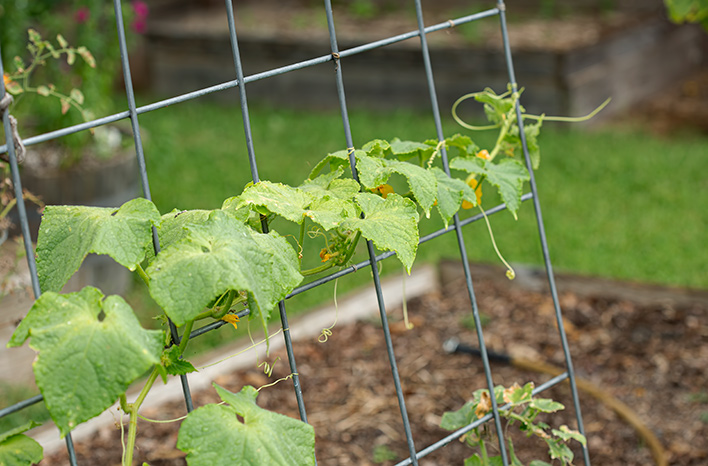 Cucumbers naturally climb using tendrils, but early guidance improves vertical alignment.