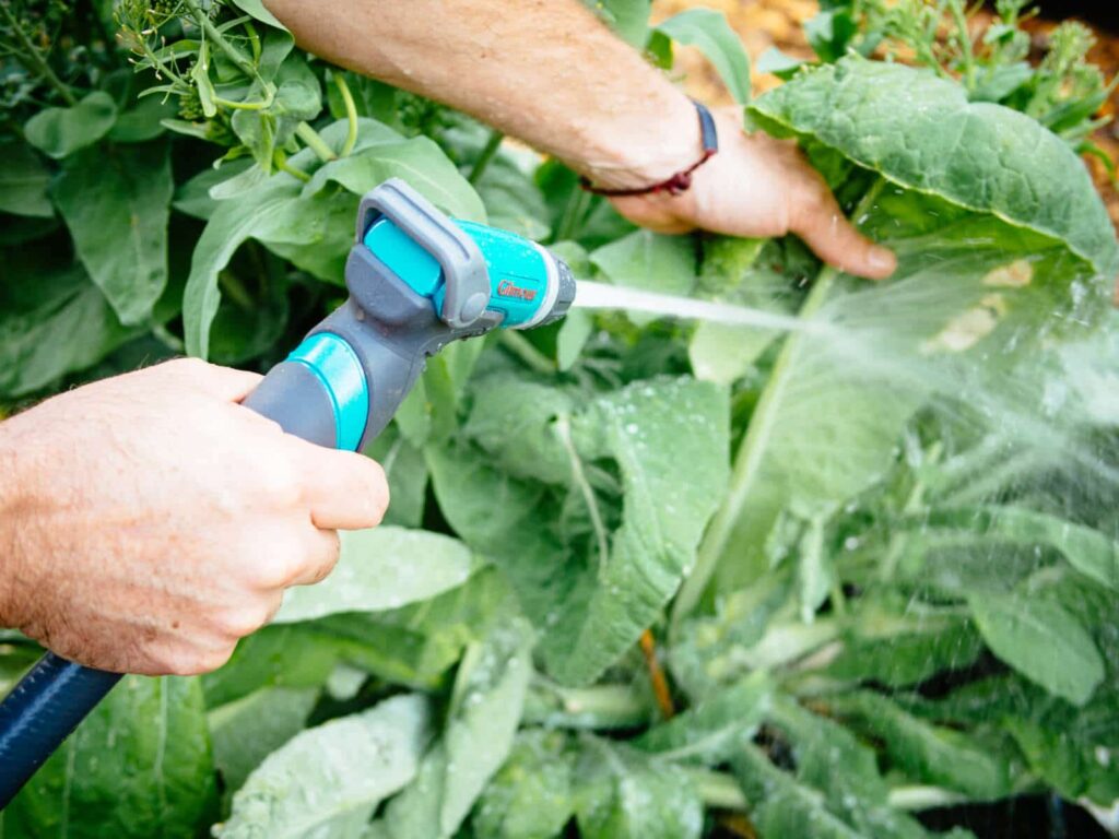 - Spray a strong but controlled stream of water on both sides of leaves.
