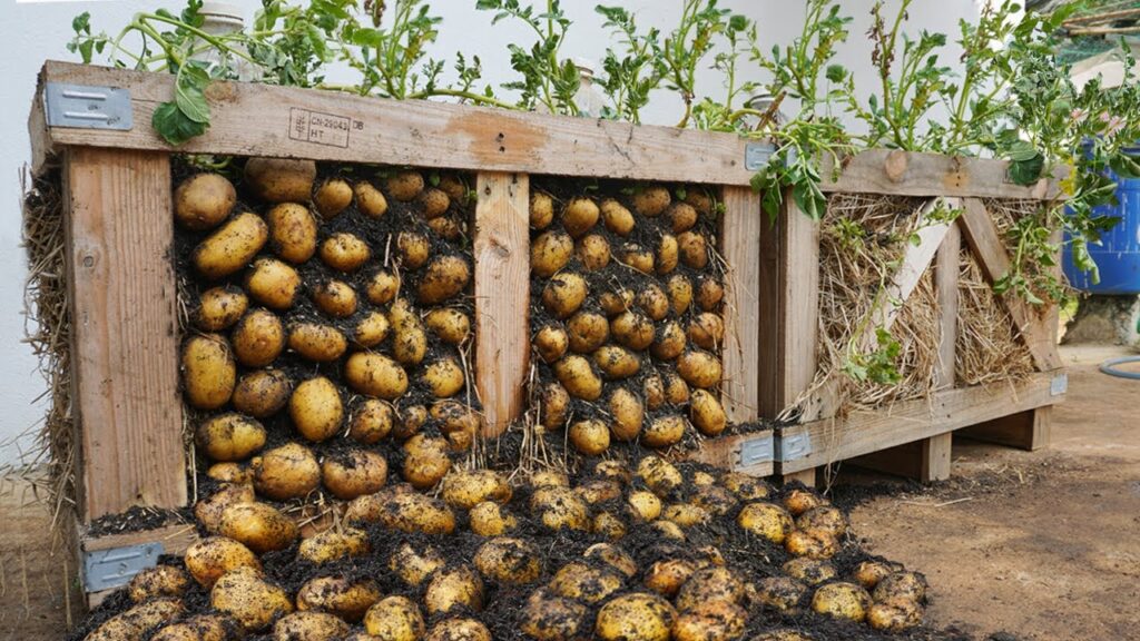 The pallet serves as the container, while soil fills the gaps. With a little stacking and mulching as the plants grow, you end up with a layered system that encourages tuber formation.
